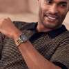 From the Modern Collection. In gold-tone stainless steel with three diamonds on black dial, three-hand date feature, metalized edge-to-edge curved crystal, screw-back case, gold-tone stainless steel bracelet with deployant closure, and water resistance to 30 metres.