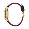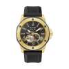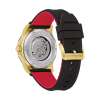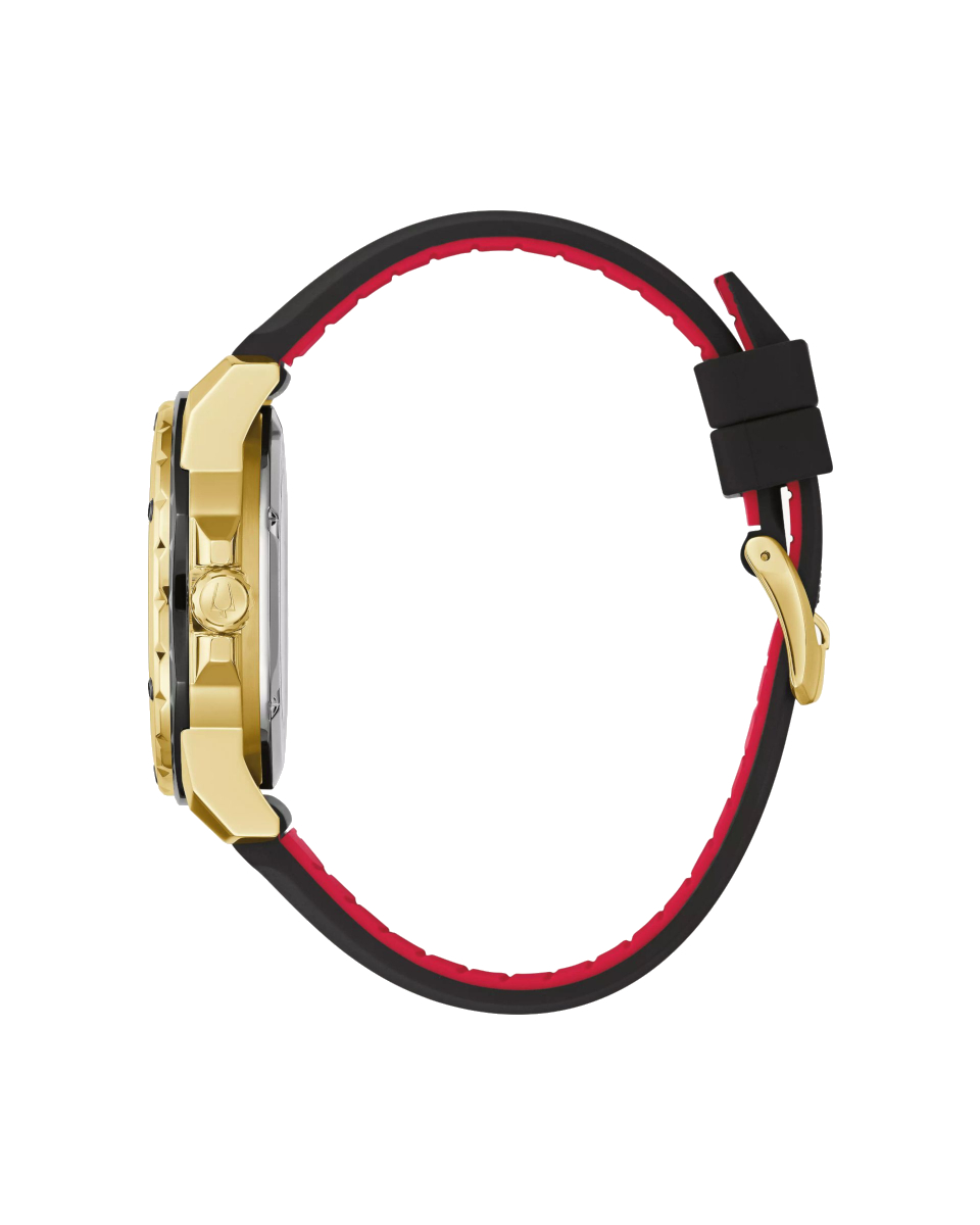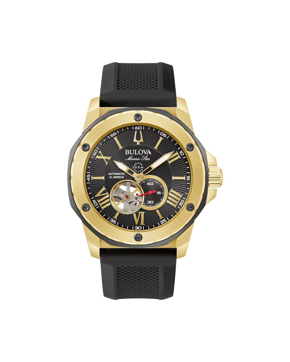 The Bulova Marine Star men’s watch is a classic timepiece with a legacy stretching back decades. The open heartbeat automatic 21-jewel movement is showcased in the dial aperture and in the exhibition case back. The gold-tone stainless steel case is accented with black and features a black dial and a flat mineral crystal. The black textured silicone strap has a contrasting red underside, and the watch is water resistant to 200 metres, living up to its name as a timepiece that can go wherever you do without missing a beat.