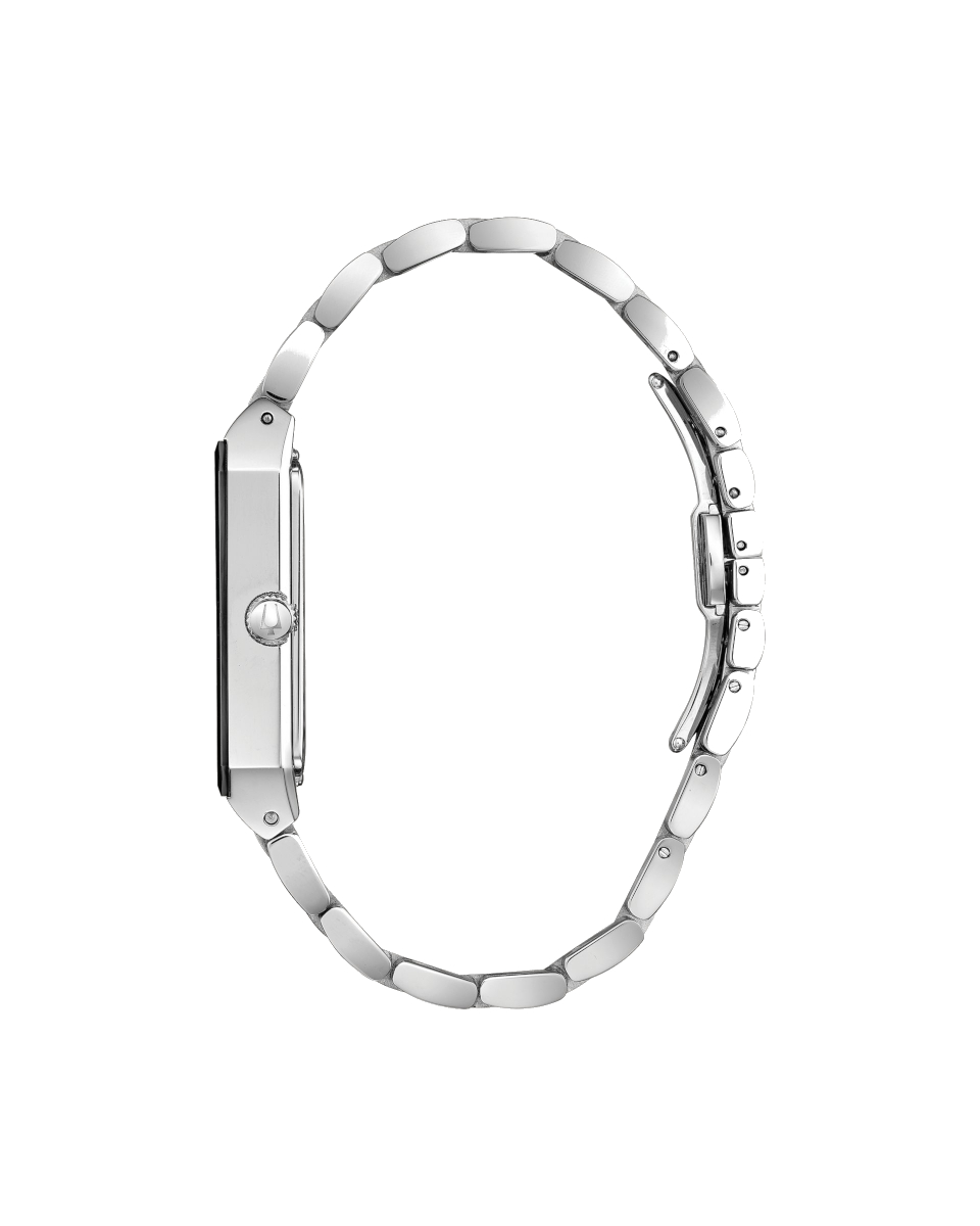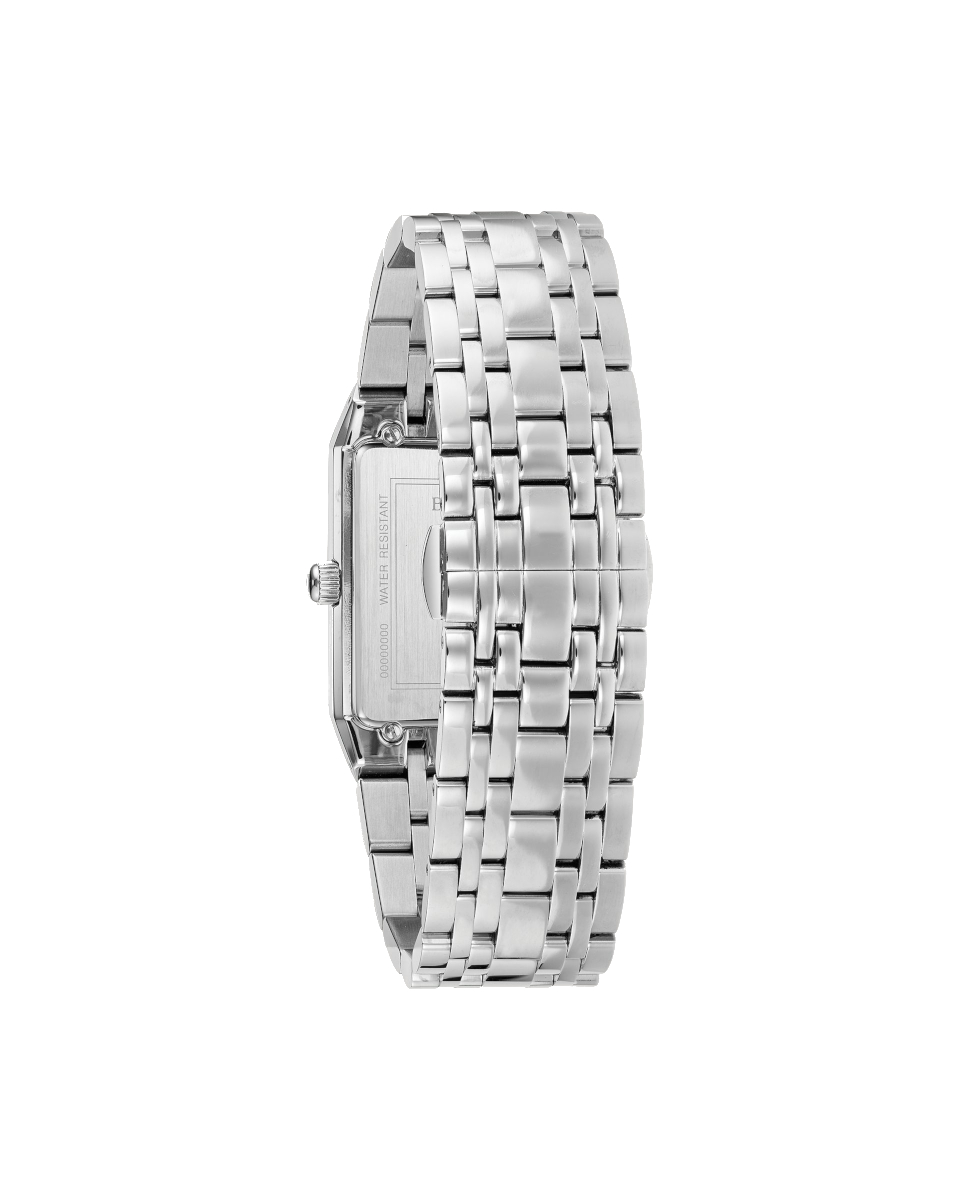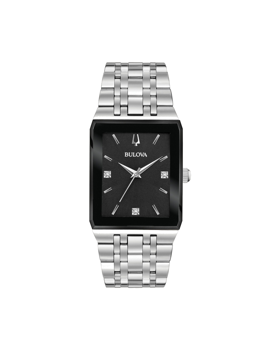 Introducing a new tank style. Silver-tone stainless steel case with edge-to-edge black faceted metalizing mineral crystal. Black dial with three diamonds set on dial. Water resistance to 30 metres.